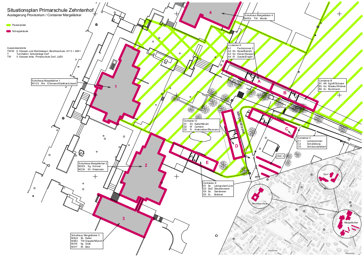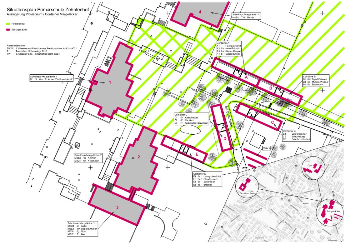 Bis zur Fertigstellung unseres komplett neuen Schulhauses "Max und Moritz" auf dem Areal "Zehntenhof" finden Sie uns in Schulraumcontainern und in Schulzimmern auf der Schulanlage Margeläcker an der Margelstrasse.